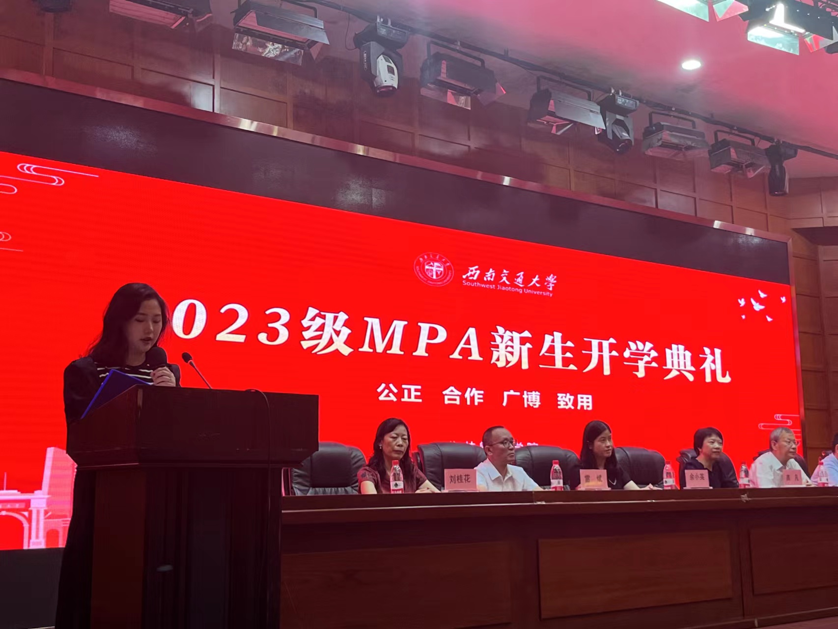 王经理首先对2023级MPA新生们表达了热烈欢迎和真挚祝福,随后对刚刚踏入西南交大的MPA学子们提出了三点希望:其一是胸怀格局。他希望每一个MPA学子在今天后能够胸怀天下,放眼未来,有“大气象”“大格局”,心藏静气与定力,能够坐得住板凳,静得下心,实现自我的不断提升;其二是心存敬畏。君子有三畏:畏天,畏大人,畏圣人之言。他相信同学们在未来都将担任不同职级的领导岗位,永葆政治本色,始终坚持崇德修身,心怀大爱。能明辨是非,弘扬社会正气,自觉做爱国主义的坚守者和传播者;其三是眼中有光。他相信大家在中心老师的关爱下,都能勇敢克服,希望在求学路上勇于追梦、敢于追梦,用青春在九里的校园里洒下奋斗的汗水。讲话最后,王经理祝愿同学们一路花香一路歌,以最自信的状态开启MPA学期新生活。