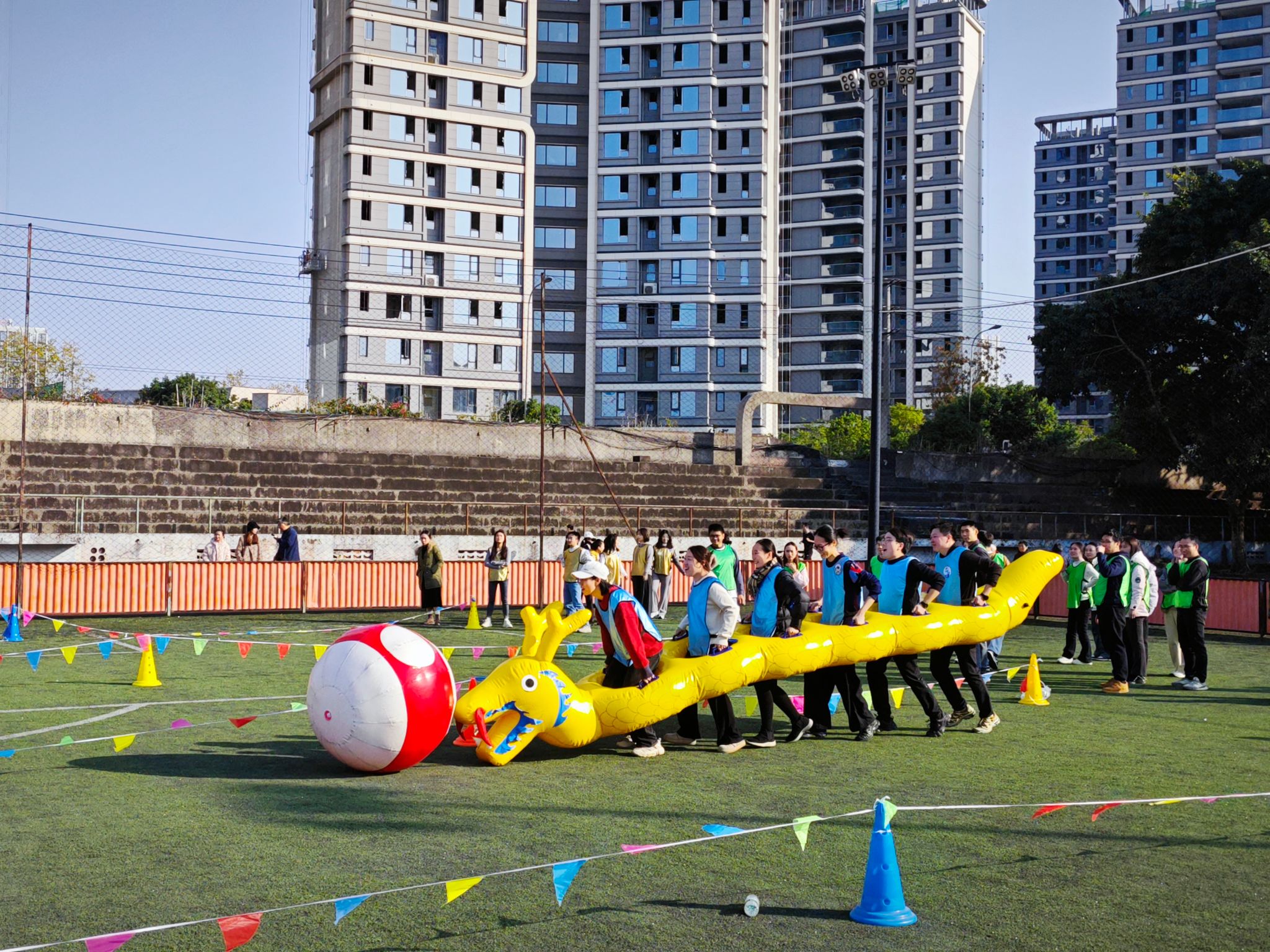 “虎步龙行”则更考验团队的默契与协作能力,师生们分成多组,手持长龙,控制龙头部位的橙色球体滚动前进。在欢声笑语中,他们不断调整动作和力度,确保团队整体行动协调统一,仿佛一条条巨龙在操场上蜿蜒前行。
