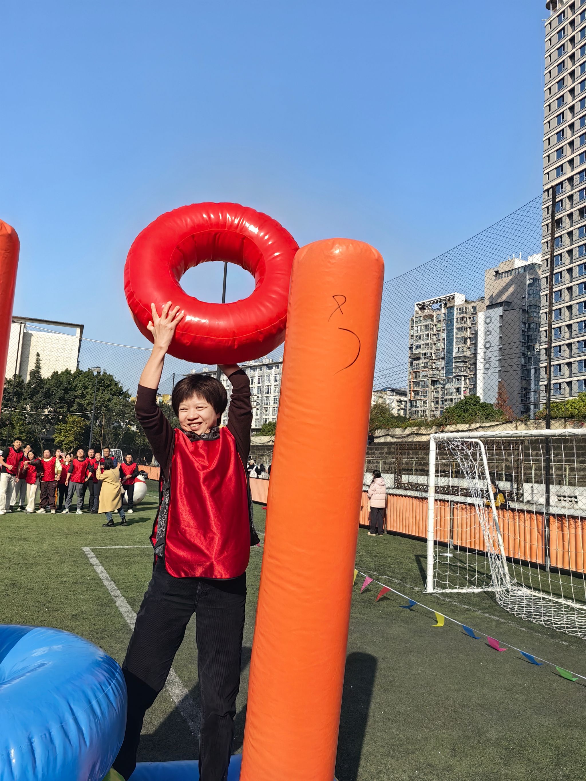 “车轮滚滚”作为压轴项目,更是将运动会的氛围推向了高潮。巨大的“车轮”道具在操场上一字排开,宛如一个个等待出征的战车。师生们分成多个小组,大家齐心协力,朝着终点冲刺,共同享受着携手前行带来的欢乐。