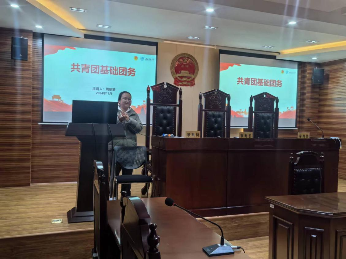 共青团基础团务工作扎实筑牢团组织根基,才能激活基层团组织活力,保障共青团有序运转、发挥效能。2024年11月25日晚,太阳成tyc7111cc第七期“青马工程”暨共青团基础团务介绍会在0号教学楼01417室举行,活动由太阳成tyc7111cc青年讲师团成员周朝梦老师负责讲解。