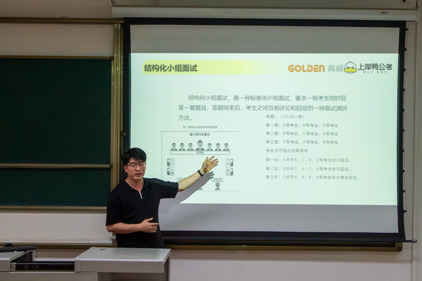 随后,罗老师重点讲解了几种主流面试形式的区别与适用情境,并特别强调了基本流程、题型设置与考查重点。例如,结构化面试强调题目的规范性和评分的标准化,适合考察应试者的综合表达与逻辑能力;无领导小组讨论则更加注重团队合作、沟通协调与临场应变。通过清晰的分类与对比,讲座帮助同学们厘清了备考重点,也让大家初步形成了对应自身目标的准备思路。