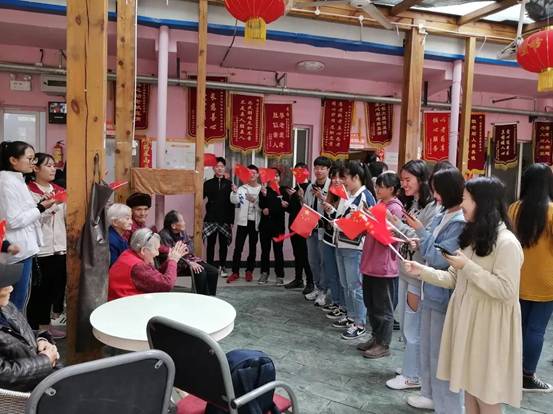 交谈环节结束,志愿者们开始表演精心准备的节目。以《三句半》表演开场,字字珠玑、喜庆欢快,很快点燃老人们的观赏热情;紧接,志愿者们带来充满青春活力的舞蹈表演,赢得老人们的阵阵掌声;最后,正值新中国成立七十年,志愿者们为老人们献唱《我和我的祖国》,动人的歌曲触动了老人们的爱国情怀,一同合唱起来,饱含深情的歌声在敬老院里回荡。