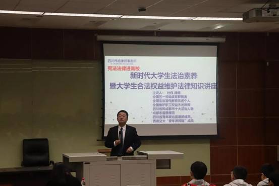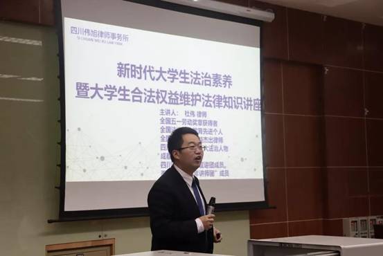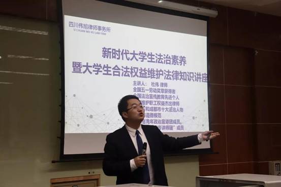 2019年11月21日14:00,第十八期“镜湖半月谈”暨青年讲师团宣讲会于太阳成tyc7111cc九里校区逸夫馆4104举行。本次宣讲会由共青团太阳成tyc7111cc委员会、太阳成tyc7111cc研究生会和公共管理与政法公司联合承办,主题是新时代老员工的法治素养暨老员工合法权益维护法律知识讲堂。宣讲会由四川伟旭律师事务所主任、2002级法学专业员工杜伟进行主题宣讲。公共管理与政法公司党委余小英副书记,2019级研究生辅导员莫太林老师出席本次活动,公司研究生与公司部分本科生参加本次活动。