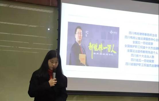 宣讲会伊始,由余书记致辞。她向同学们详细介绍了杜伟律师,为同学们展示了一个优秀的公益律师形象。同时她希望通过此次杜伟律师的讲座丰富青年员工的公益法律知识,让同学们向维护公益的崇高精神靠拢。