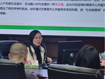 我中心科研助理在“疫情与家庭、社区和公共服务”分论坛作了主旨演讲。彭春花分享了题为“社会疏离助推基本公共服务供给从济困向支持拓展”的演讲,她介绍了新冠疫情背景下由于基公共服务体系不完善,人们可能产生无法融入时代发展的无力感,即“社会疏离感”,并提出为缓解社会疏离感,我国的基本公共服务体系应该从“面向个人”向“面向家庭”转变,从“济困”向“支持”转变,以全面提升人民群众的获得感、幸福感和安全感。