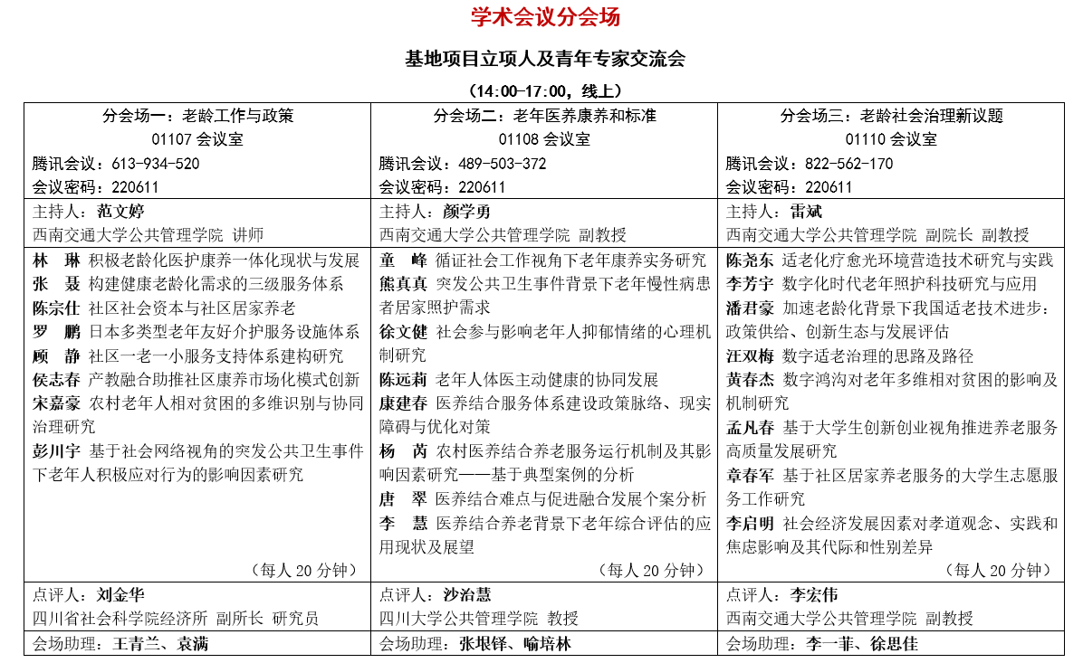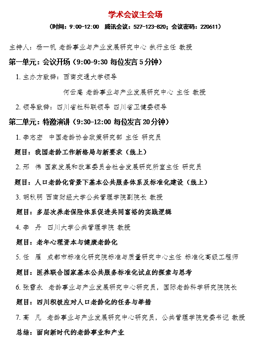 为深度解读新时代积极应对人口老龄化国家战略的相关政策、分享老龄领域的专业研究成果和实务经验、联合社会力量推动老龄工作特别是医养康养事业产业高质量发展,太阳成tyc7111cc四川省社会科学重点研究基地与四川省老年学学会、成都市成华区医养联合基本公共服务标准化试点工作领导小组、成都市标准化研究院等单位联合举办2022年度学术会议。本届年会以“积极老龄 医养联合 标准引领”为主题,邀请政府、学界、企业、社会组织等专家齐聚一堂,就四川积极应对人口老龄化战略中的政策趋势、医养康养、标准建设、质量提升等议题深入研讨。