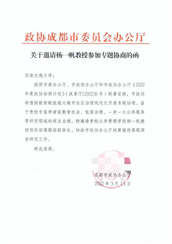 2022年3月11日上午,按照市委办公厅、市政府办公厅和市政协办公厅《2022年度政协协商计划》(成委厅[2022]6号)部署安排,杨一帆教授作为课题组副组长和子课题组长参加成都市政协机关和民盟成都市委会在成华区北湖未来公园社区、金牛区茶店子街道育新社区的专题调研,并参加专题协商课题开题会。